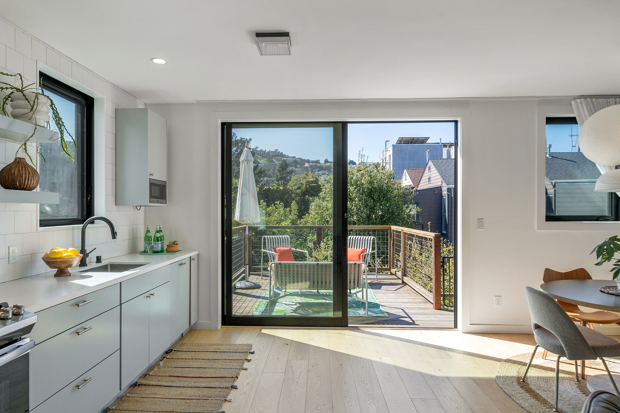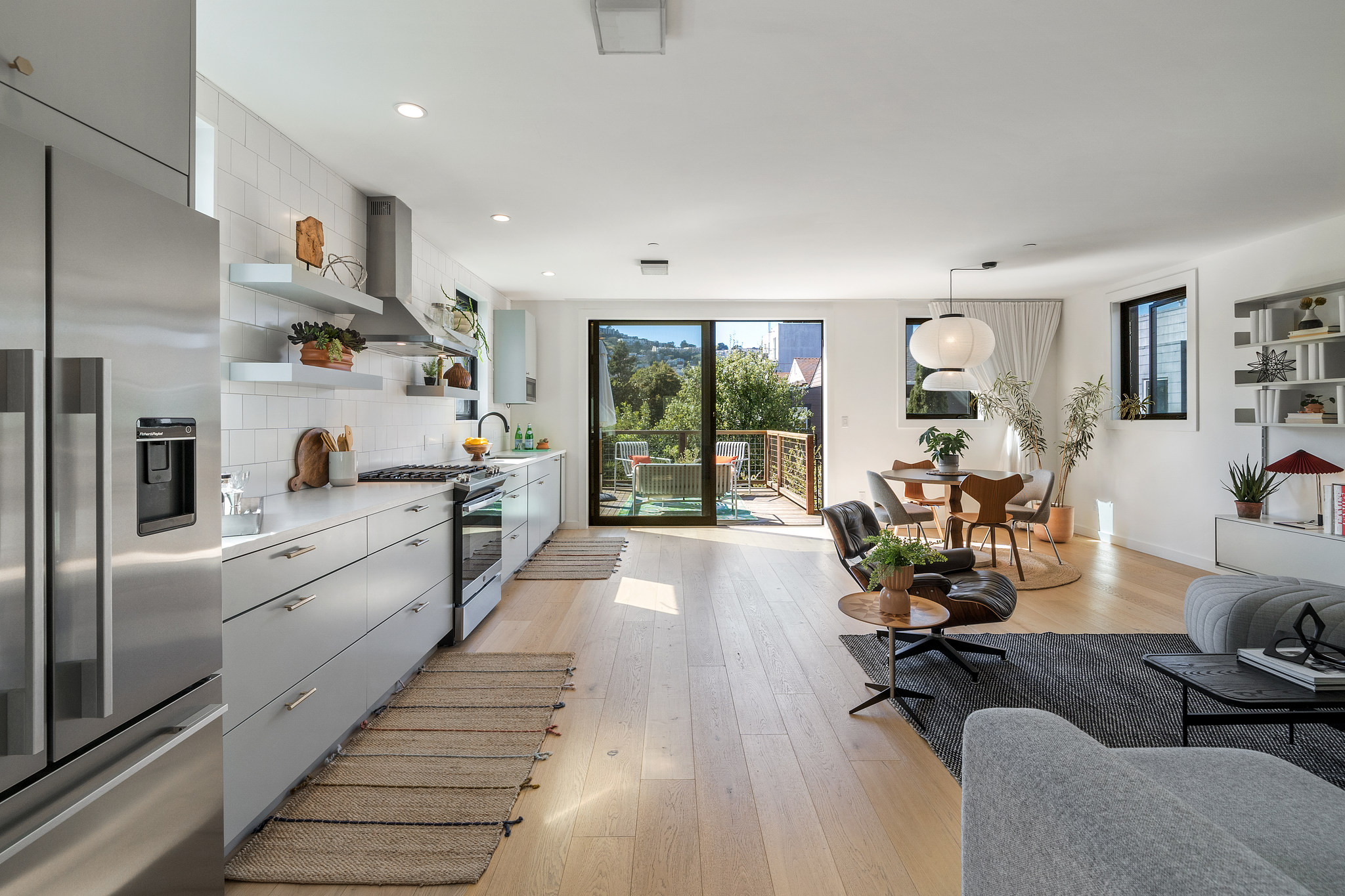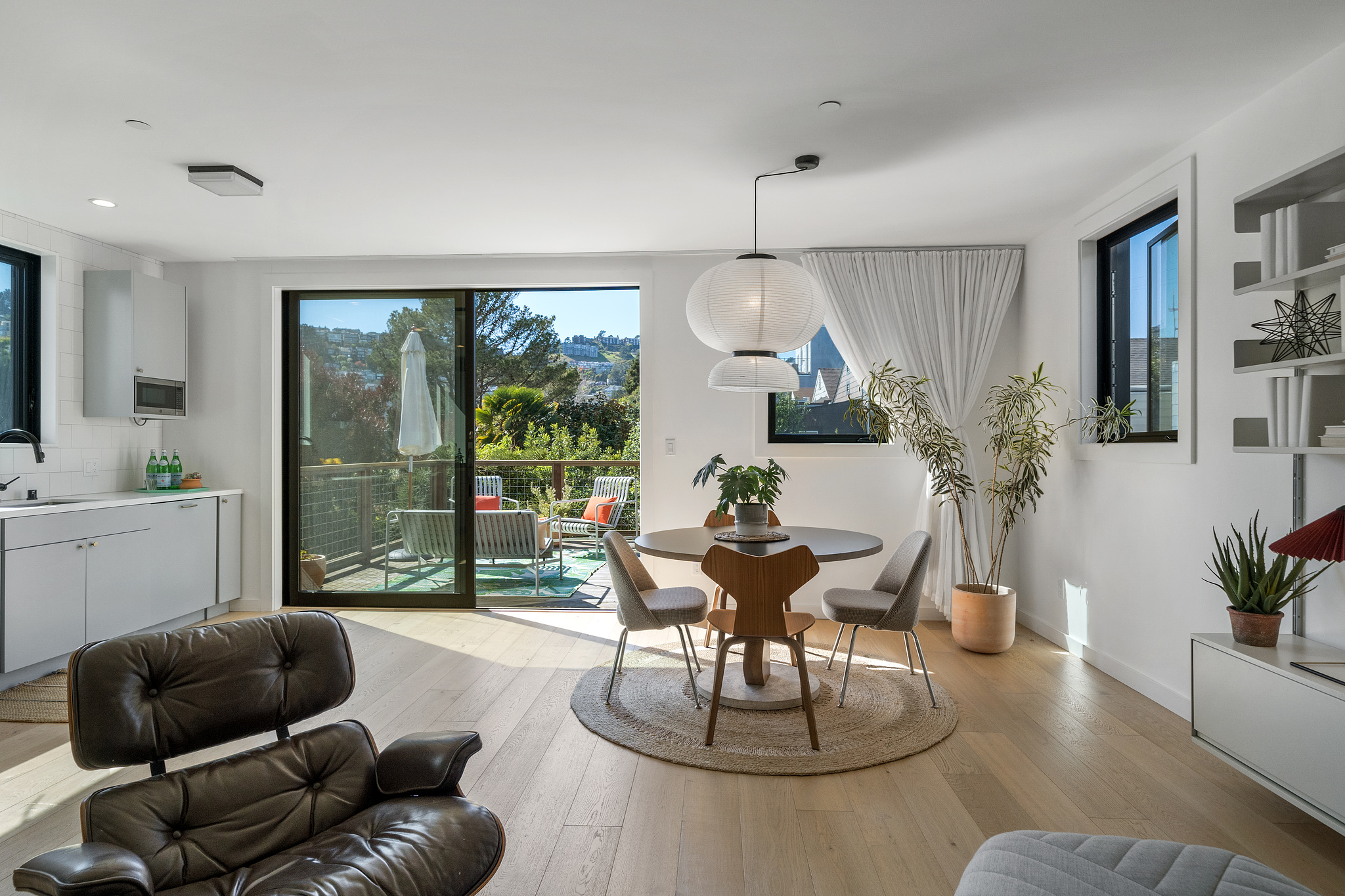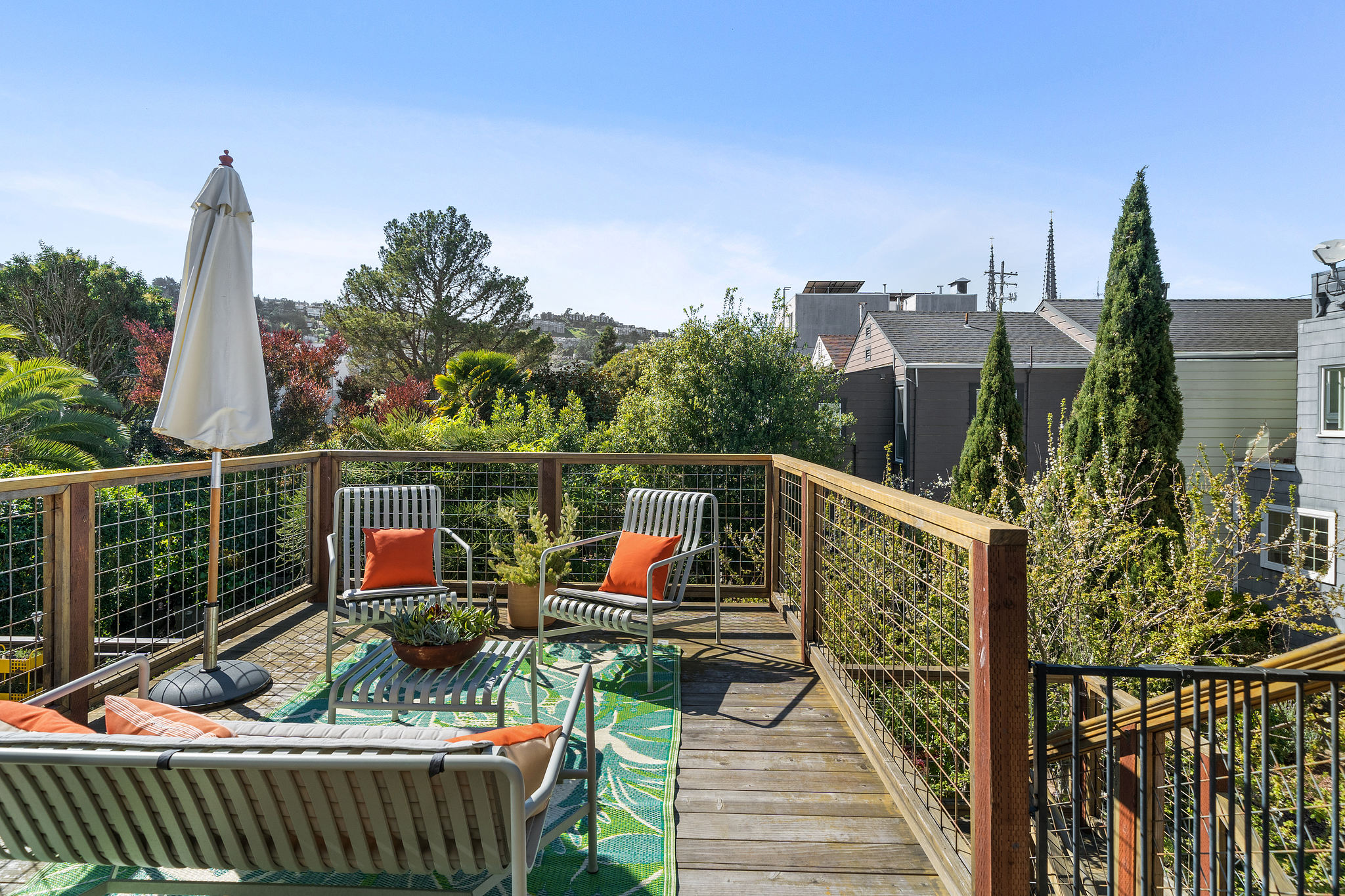 Occupying the entire second level of this renovated contemporary building is this spacious and bright three bedroom, two bathroom home. The heart of this home is the open concept living space. This light, bright great room features a modern kitchen with expansive countertops and luxury level appliances, a dining area and living space, with a large sliding door opening onto a West-facing private deck, perfect for the warm Noe Valley weather. Views of verdant tree tops and expansive sky abound. One ensuite bedroom and two additional bedrooms or offices- all with clean, modern lines and newer windows. Other amenities include in-unit washer and dryer, additional storage, and one car independent garage parking with an ev charger. One block from area shops, restaurants, and public transportation makes this a perfect city home. This TIC represents a 37% ownership in the three unit building.