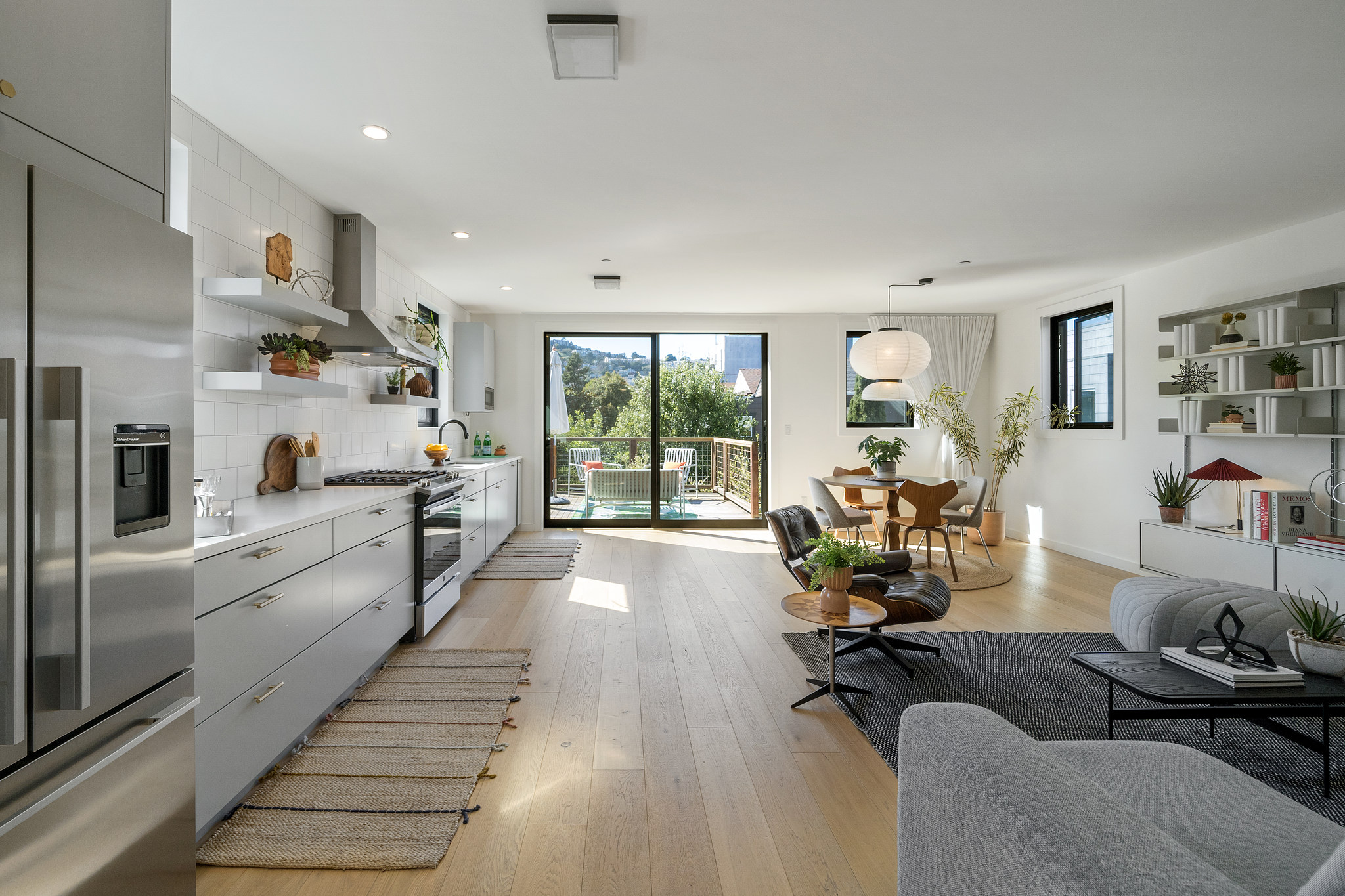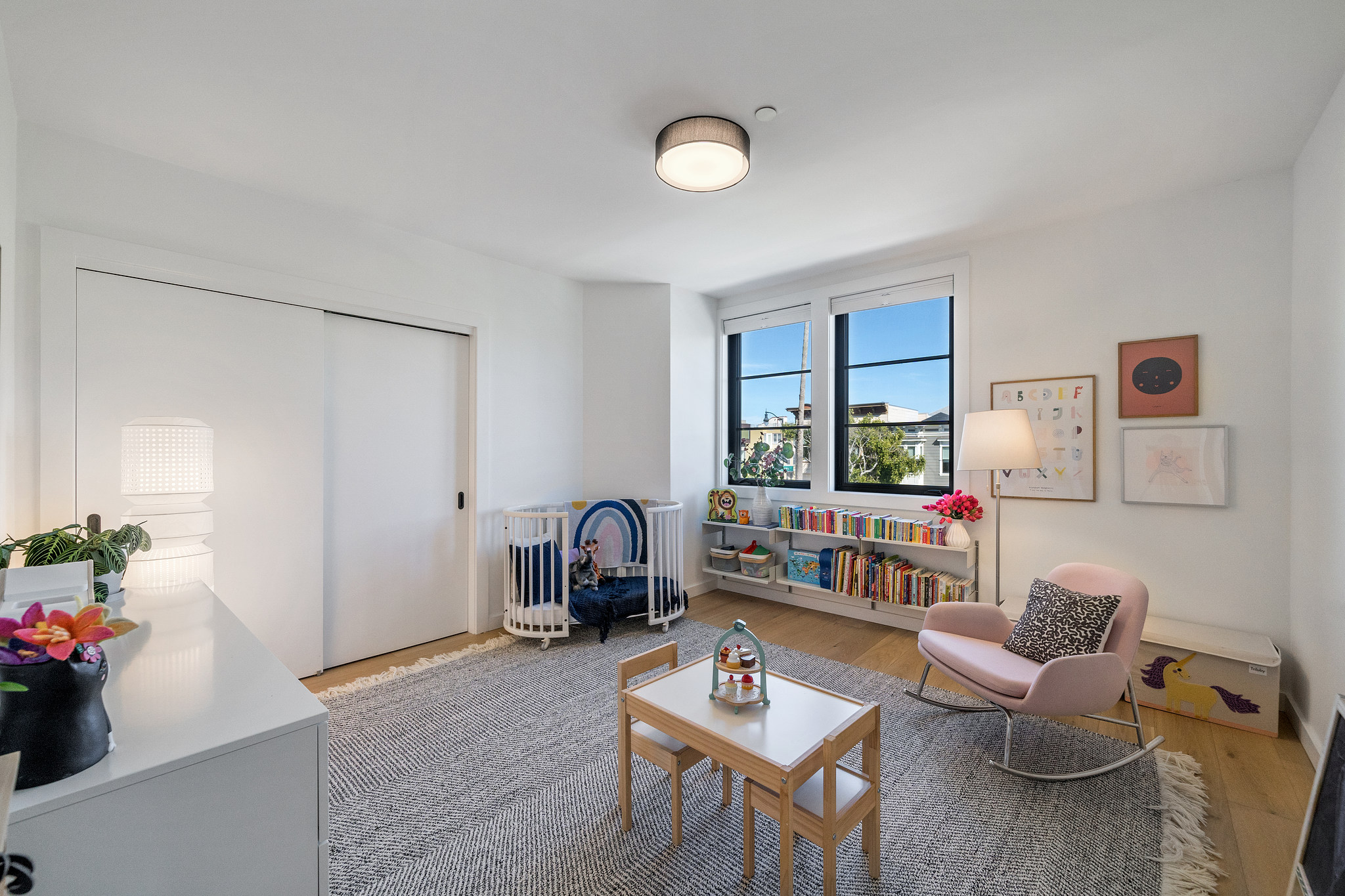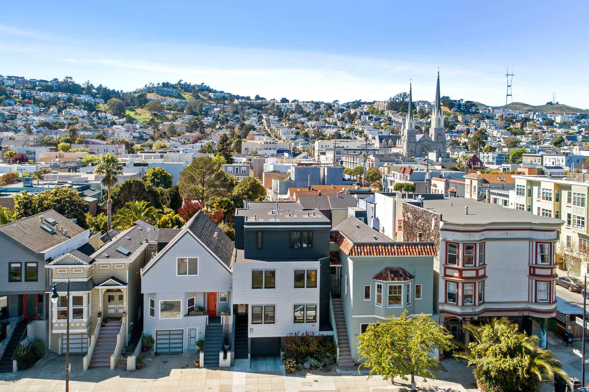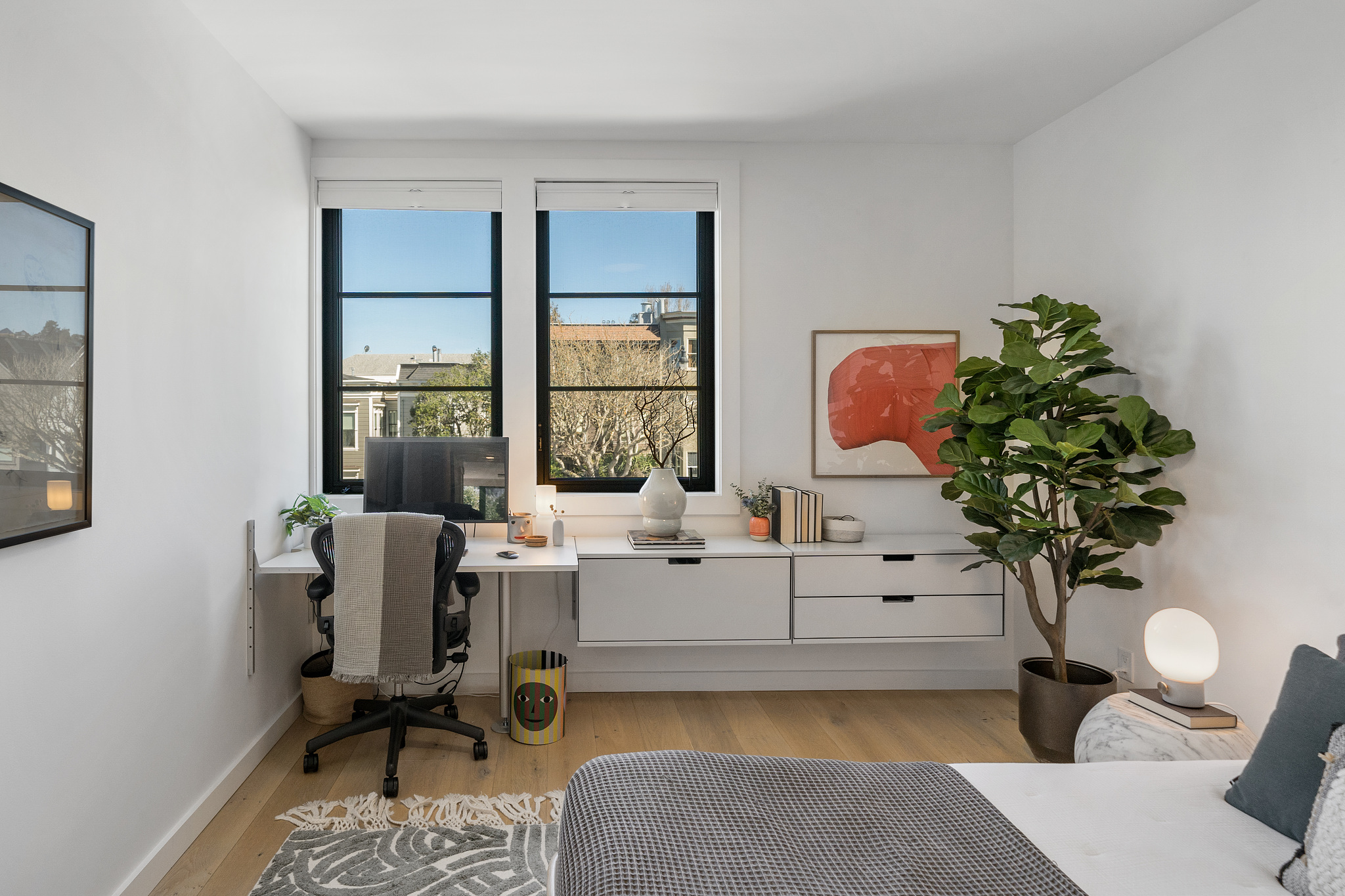 Occupying the entire second level of this renovated contemporary building is this spacious and bright three bedroom, two bathroom home. The heart of this home is the open concept living space. This light, bright great room features a modern kitchen with expansive countertops and luxury level appliances, a dining area and living space, with a large sliding door opening onto a West-facing private deck, perfect for the warm Noe Valley weather. Views of verdant tree tops and expansive sky abound. One ensuite bedroom and two additional bedrooms or offices- all with clean, modern lines and newer windows. Other amenities include in-unit washer and dryer, additional storage, and one car independent garage parking with an ev charger. One block from area shops, restaurants, and public transportation makes this a perfect city home. This TIC represents a 37% ownership in the three unit building.