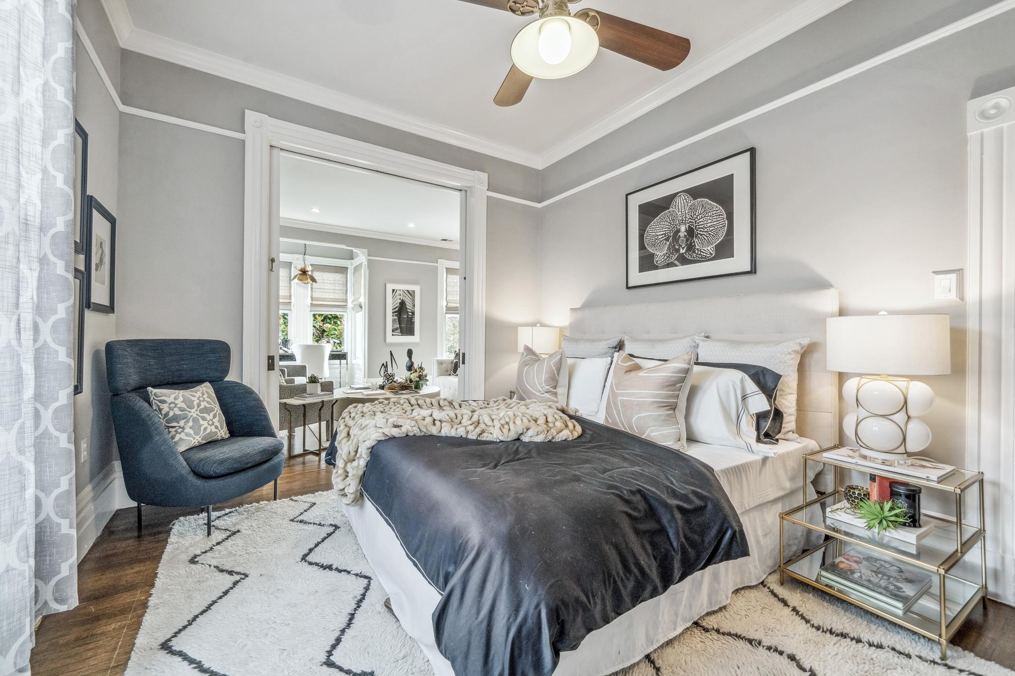 Urban retreat, perfect for those seeking a harmonious blend of old world charm and modern amenities in a vibrant city setting. This beautifully renovated TOP-floor condo features an abundance of natural light, hardwood floors, high ceilings, picture moulding, and charming bay windows. The chef’s kitchen is equipped with a Wolf range and oven, island, dining area and 2 walls of windows. With two bedrooms and two full bathrooms, the home includes a spacious family room or formal dining room with a dry bar with a wine fridge and ice maker. In-unit laundry, wine cellar, additional storage, parking and a shared backyard.